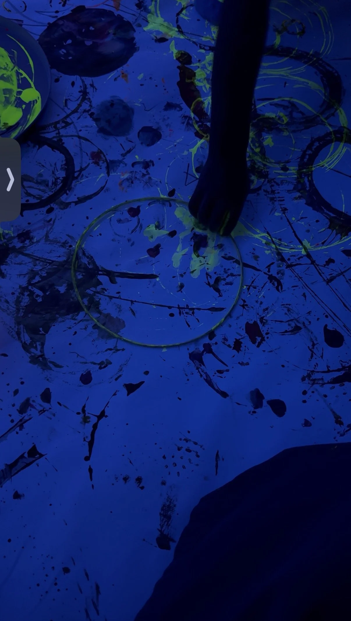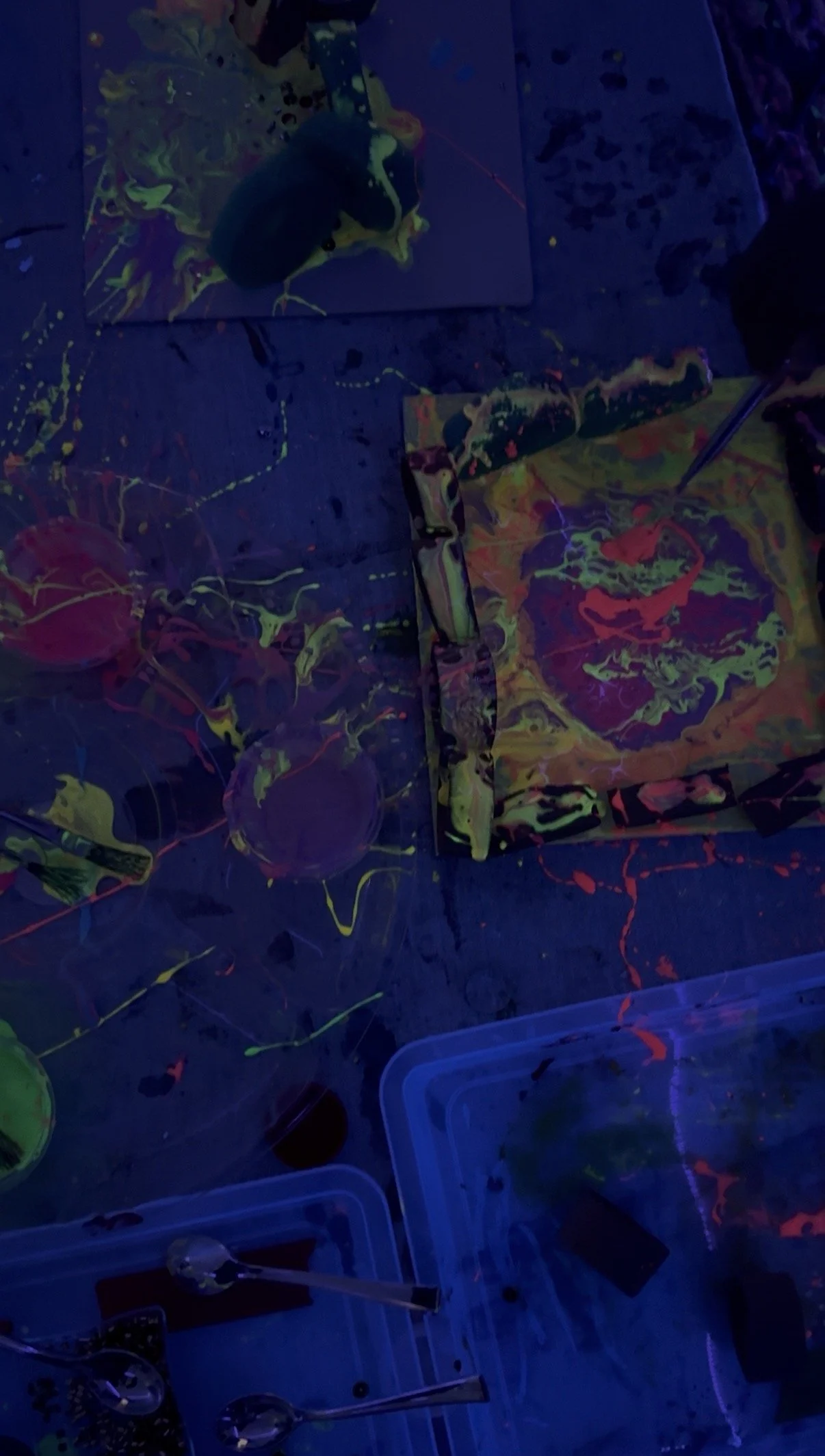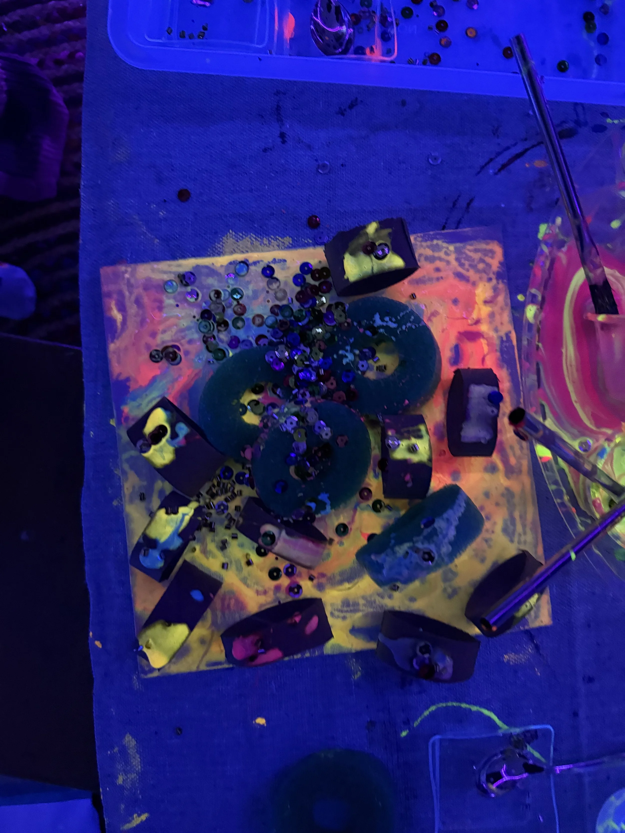 The studio environment shifted dramatically for this session. The lights were dimmed and black light filled the room, transforming the space into a glowing environment. Neon materials became illuminated, paint, objects, and previously placed circular stickers on the wall began to glow.