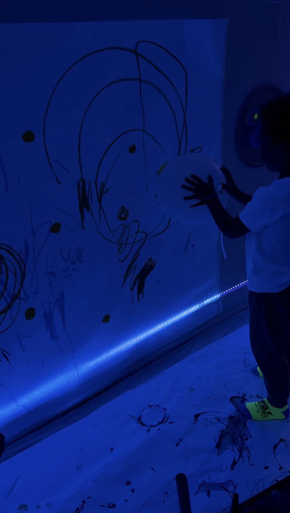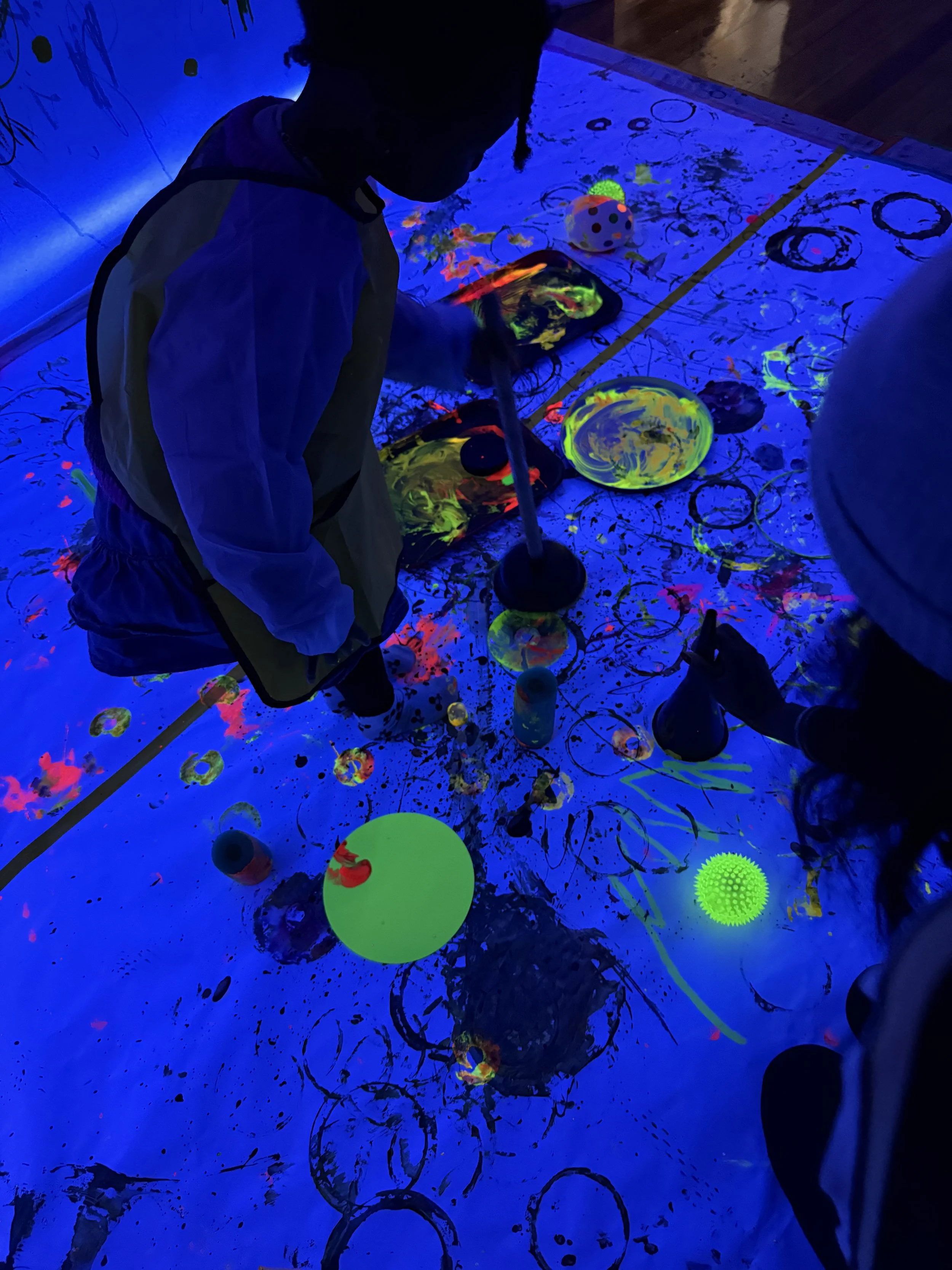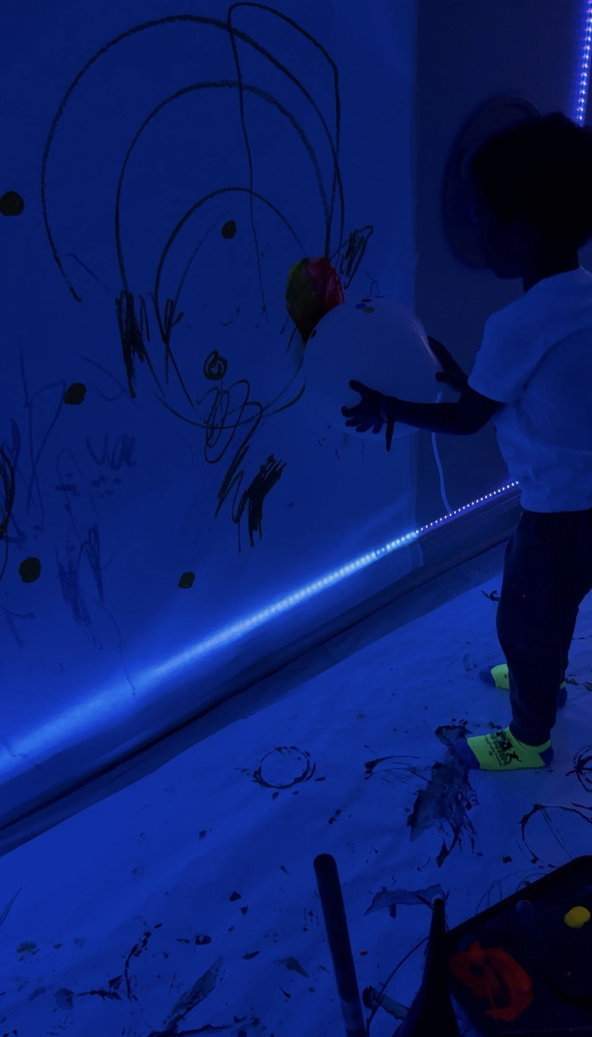 After working at the table, children moved back into the larger studio space. The glowing environment invited continued experimentation.