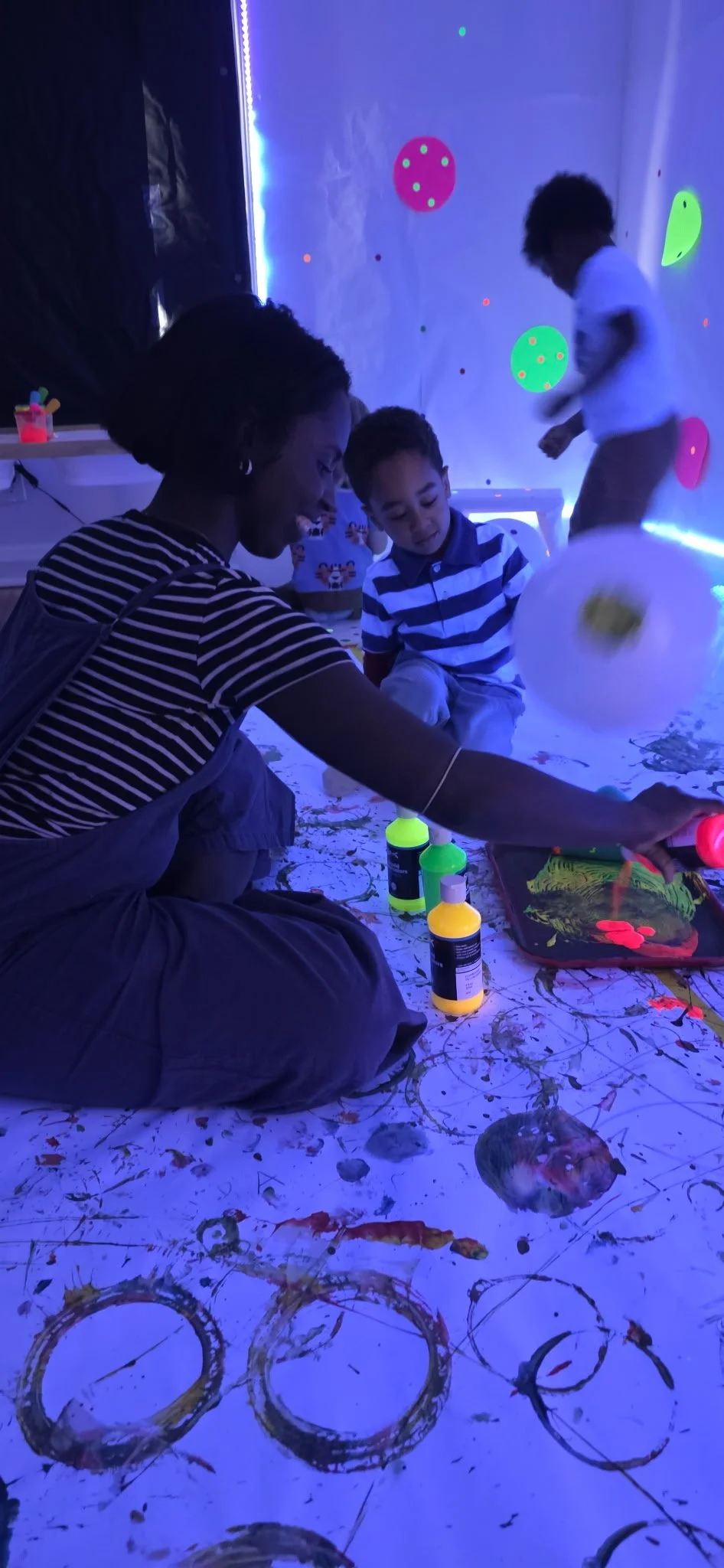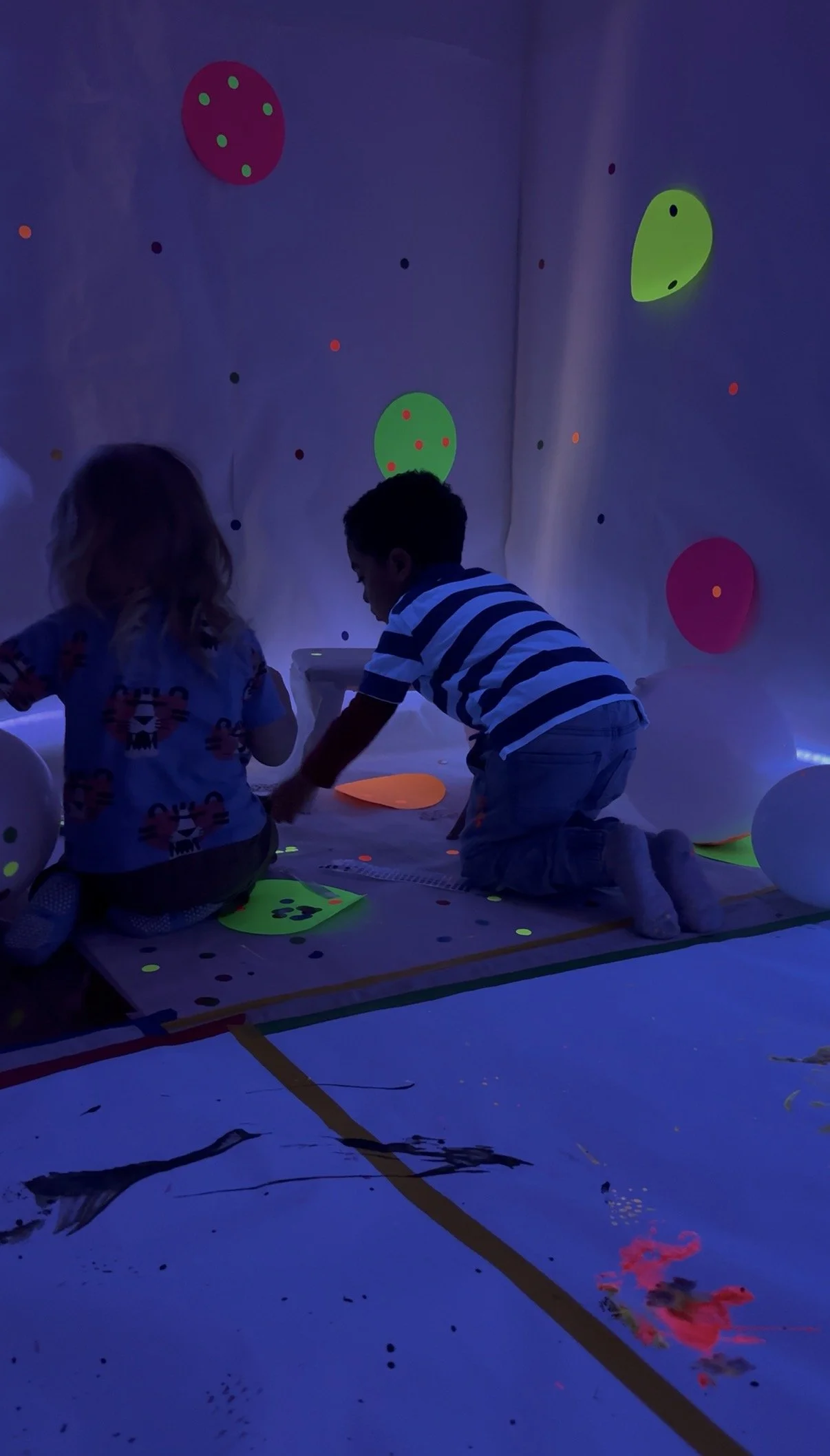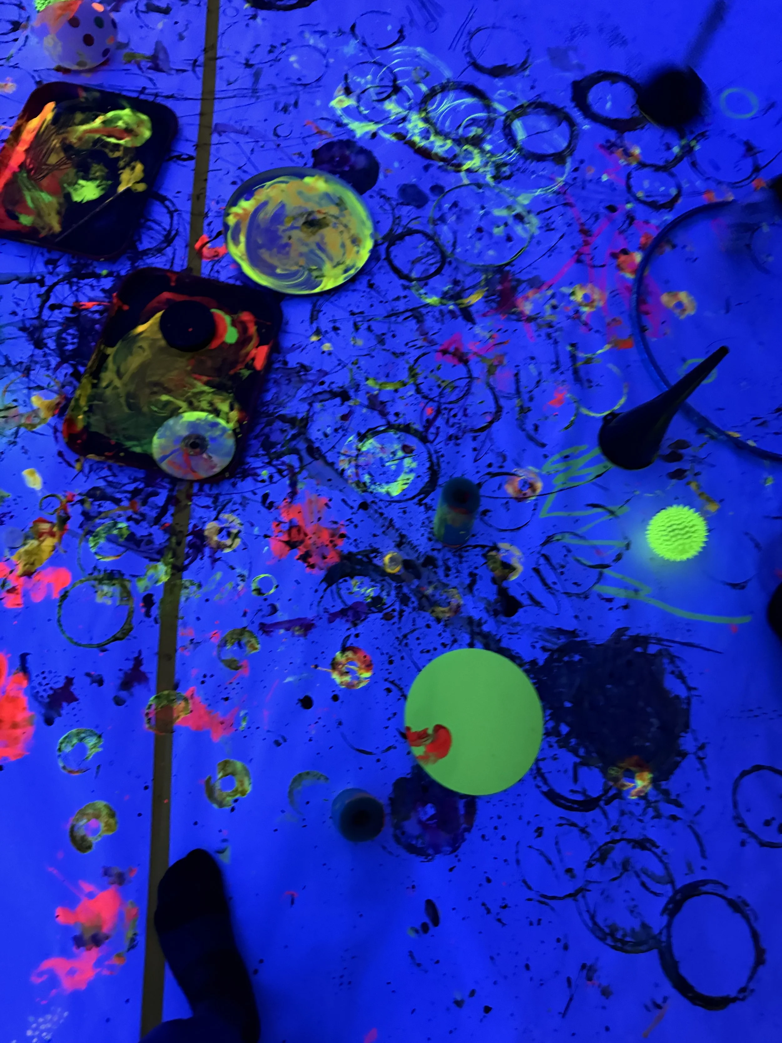 After working at the table, children moved back into the larger studio space. The glowing environment invited continued experimentation.
