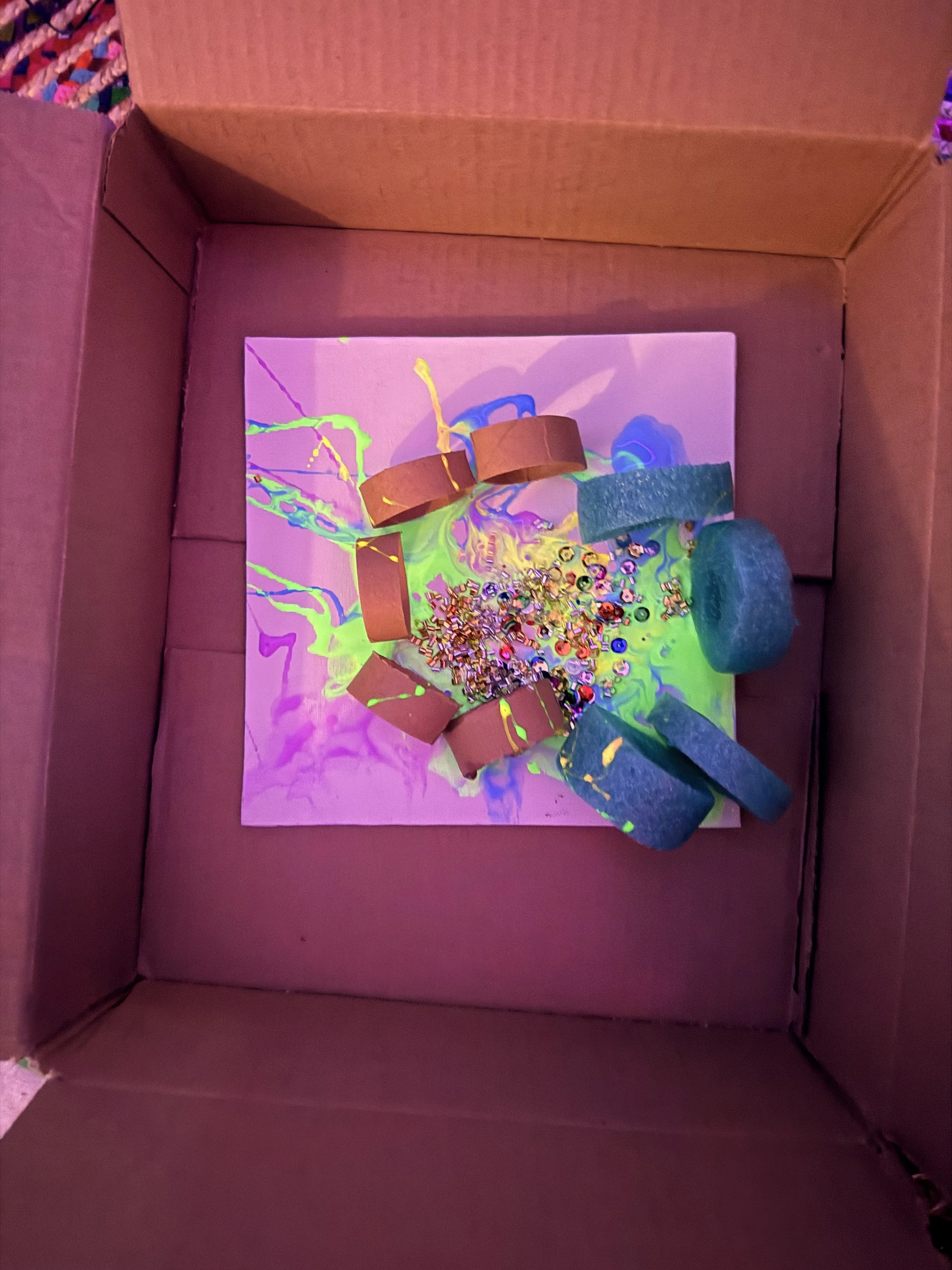 Mateo arranged circular objects around the edge of his canvas, forming a boundary, and stated, “I’m making a square.” Within the space, he added layers of paint, observing how colors blended and marbled together.