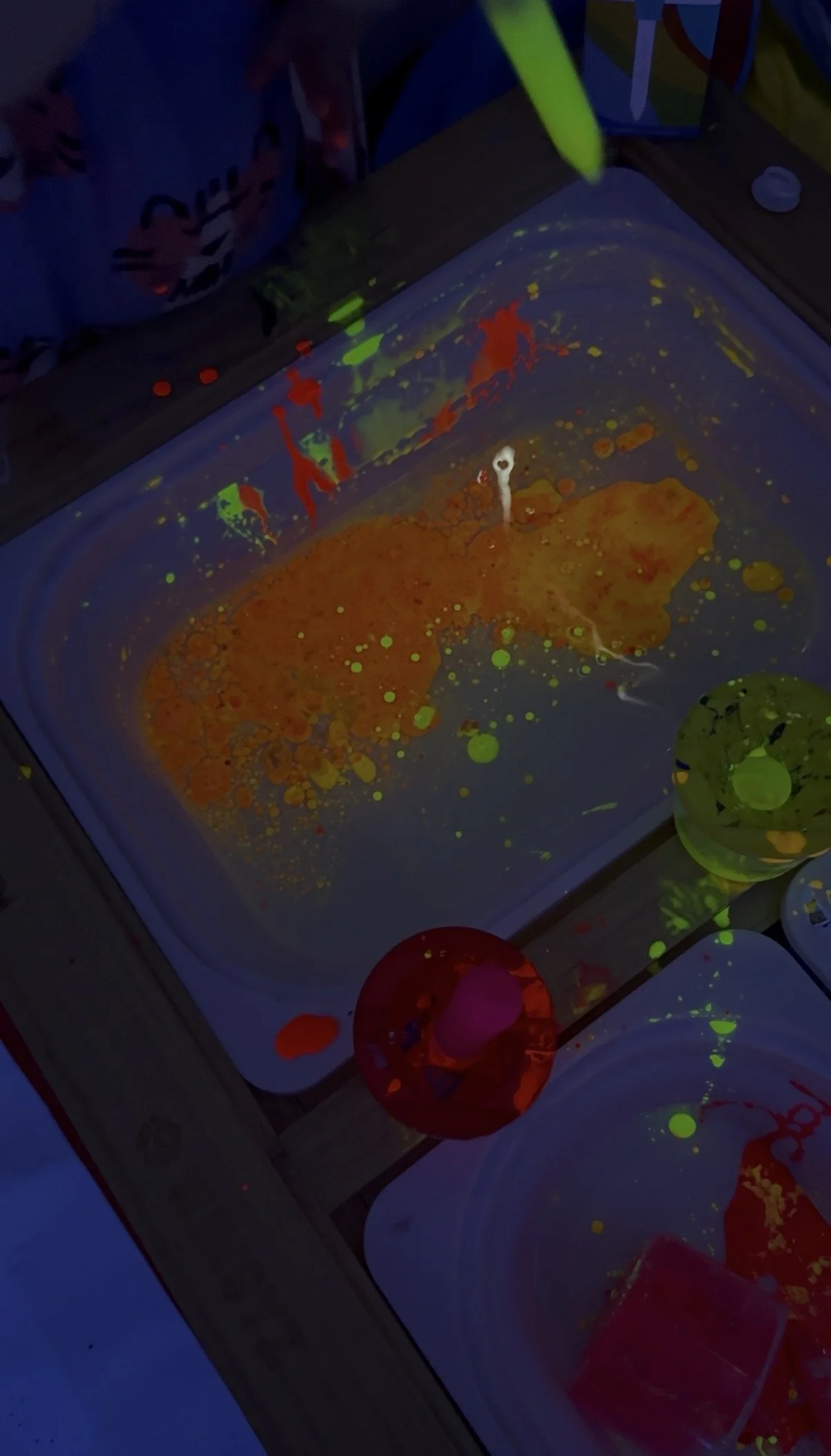 At the table, children were introduced to a second invitation using neon paint, glue, and circular materials such as pool noodles and cardboard rolls. There was no single direction, only an invitation to explore.