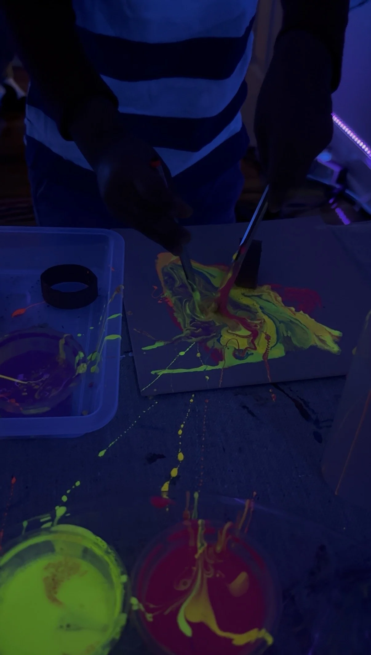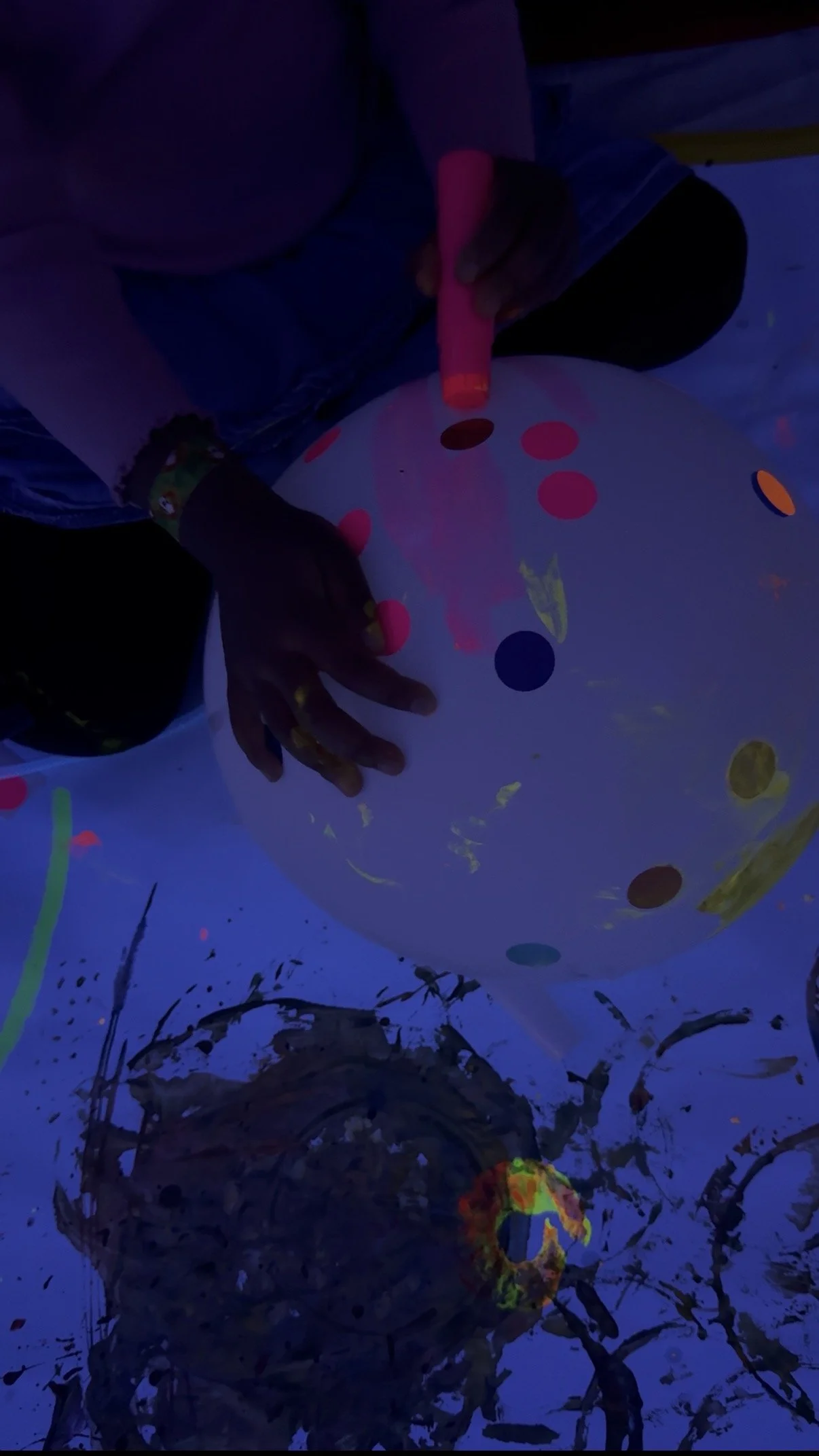 Mateo dipped a balloon into paint and pressed it against the wall, slowly lifting and dragging it to create glowing prints.