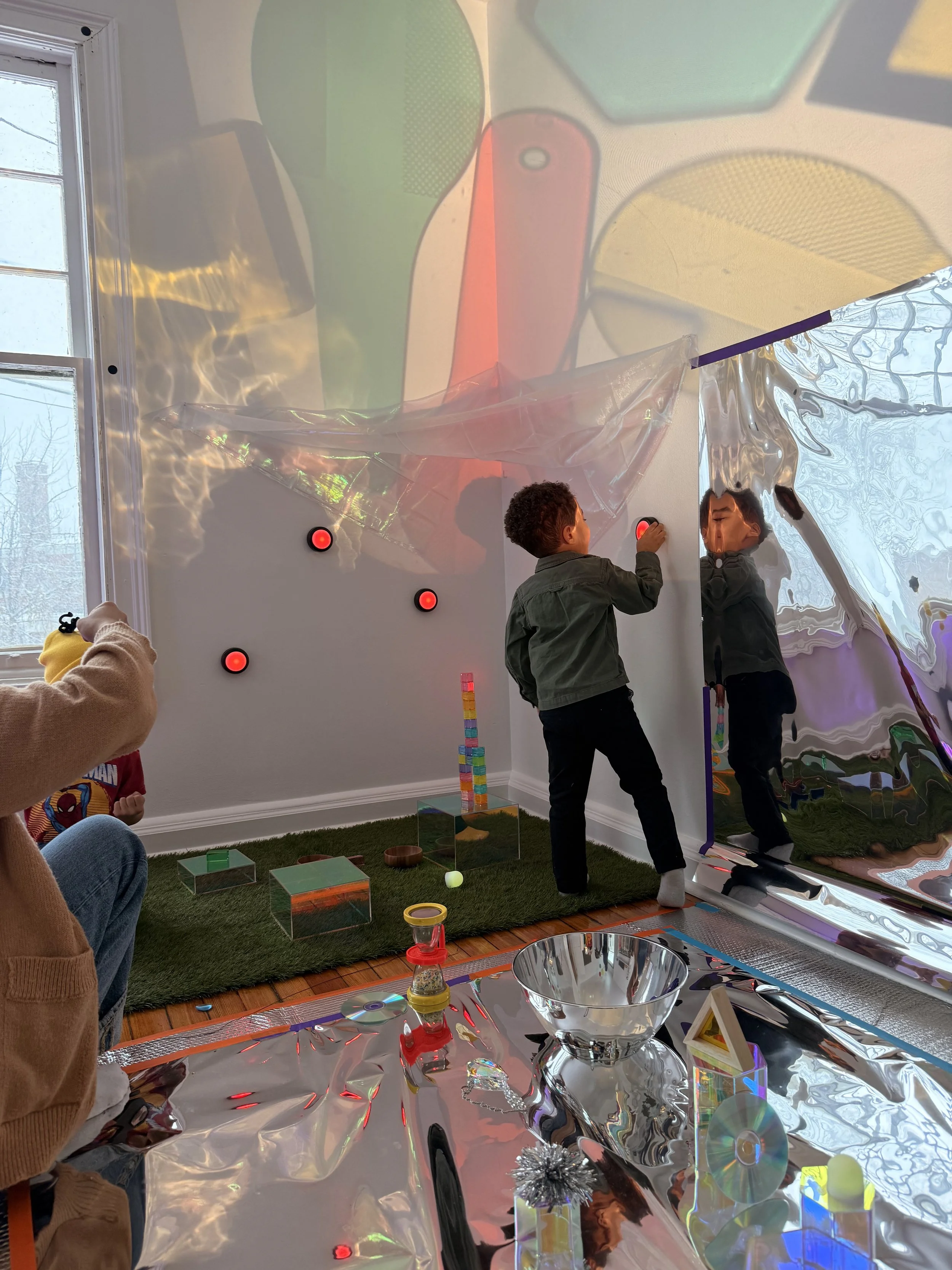 Each material in the space was intentionally chosen to invite open-ended exploration. Mirrors, translucent objects, reflective paper, pebbles, and light sources offer children opportunities to investigate: