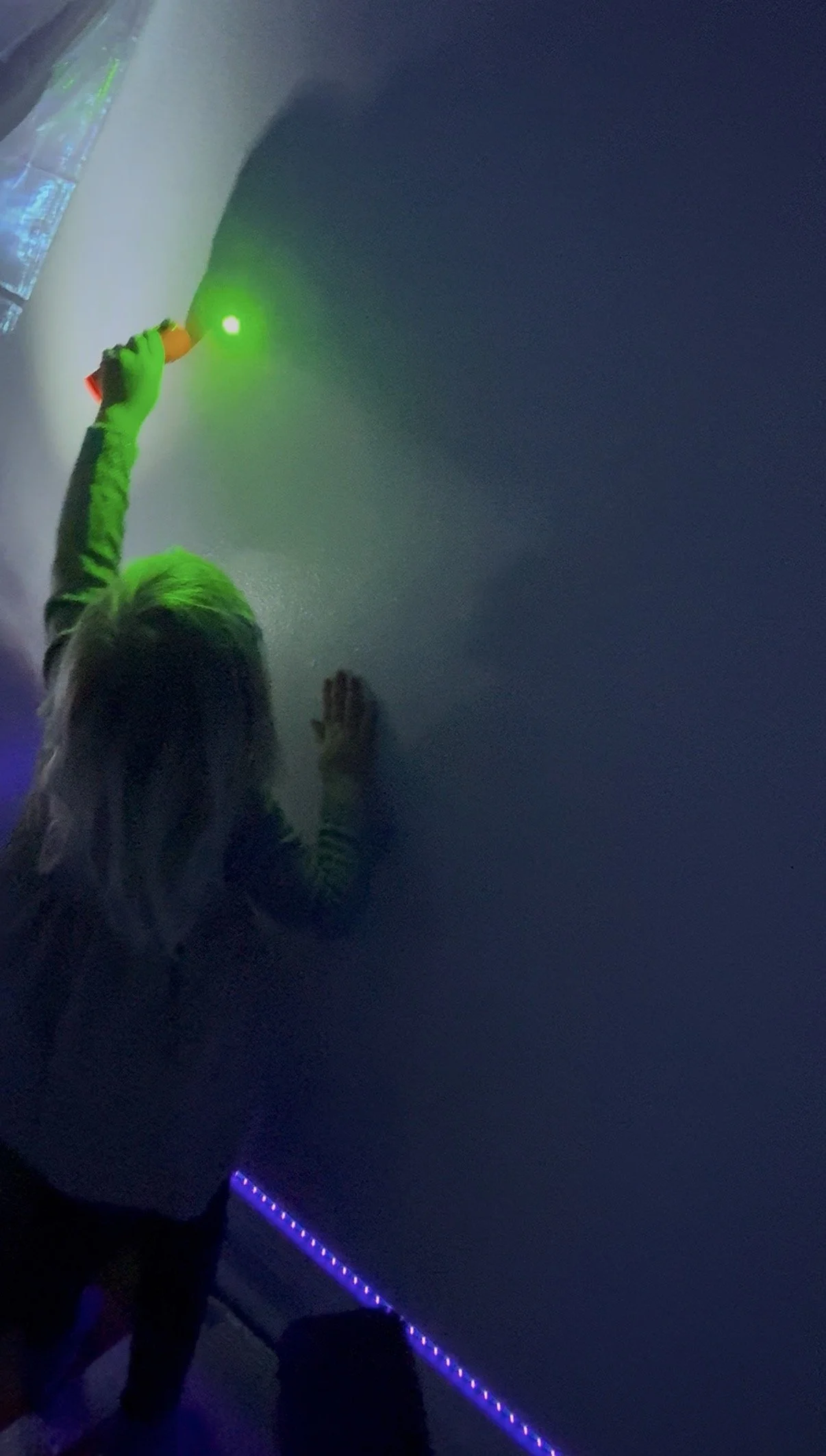 Nearby, Mateo picked up a flashlight and began moving it around the room, sweeping the beam across walls, floors, and materials. He watched closely as the light revealed glowing edges, reflections, and sudden bursts of color, noticing how the room responded each time he shifted his hand.