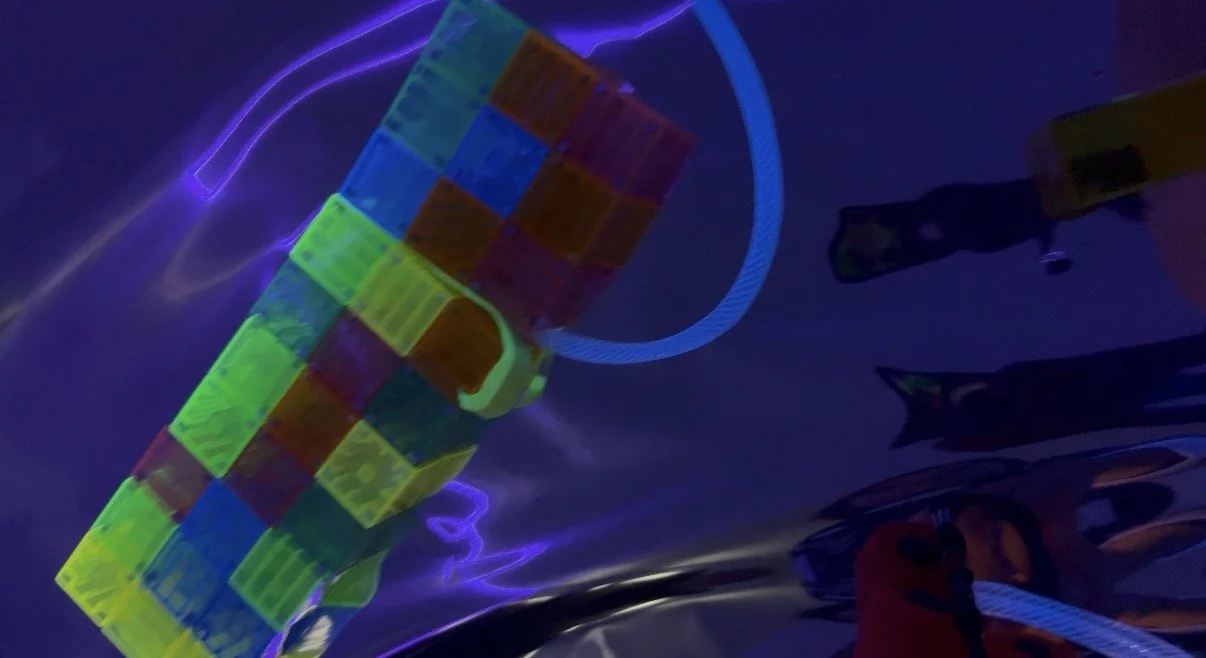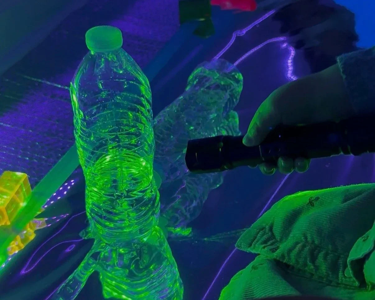 They noticed that objects behave differently under black light, some glow, some reflect, some transform only when light passes through them. They explored how surfaces matter, how darkness makes light visible, and how materials can either absorb or reveal color.