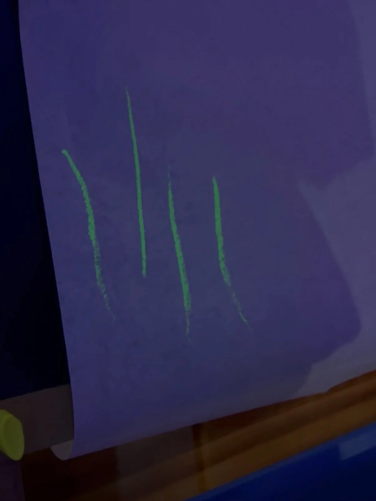 She added two more strokes and watched closely. I wondered aloud if the glow would change on a different surface and taped black paper to the floor. Gigi knelt down and began drawing again. This time, the glow was deeper. When she tried the white paint stick, it shone even brighter against the dark background. She moved between papers, comparing, testing, noticing.