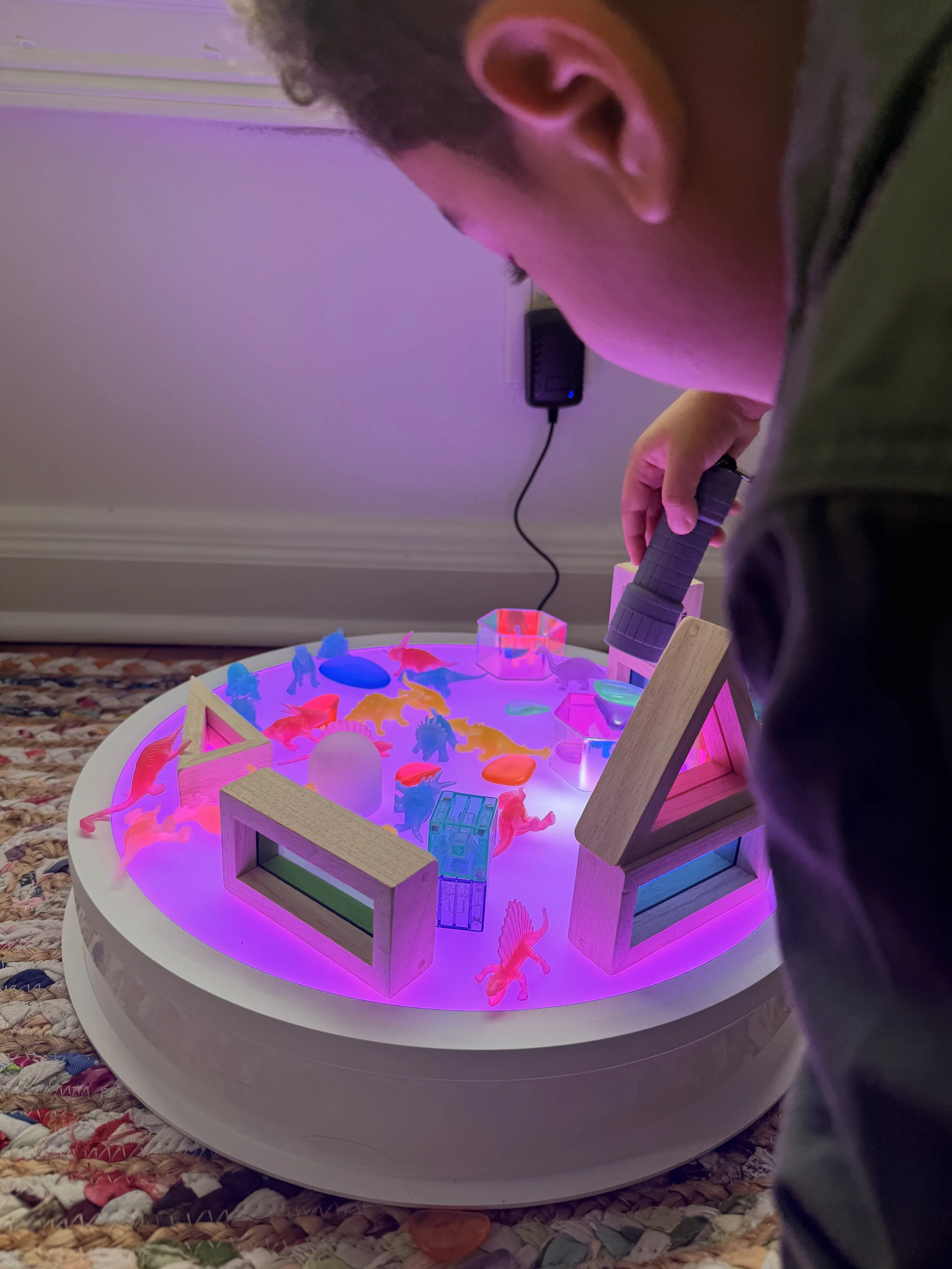 Dylan approached the materials with the curiosity of a scientist. Holding a flashlight, he tested how light behaved, shining it on the wall, through different materials, and onto the dinosaurs scattered across the space. He moved thoughtfully to the light table, passing the beam over each object and observing how the light changed their appearance. When he noticed how the pebbles shifted color on and off the light table, he paused, visibly amazed, watching transformation happen right before his eyes.
