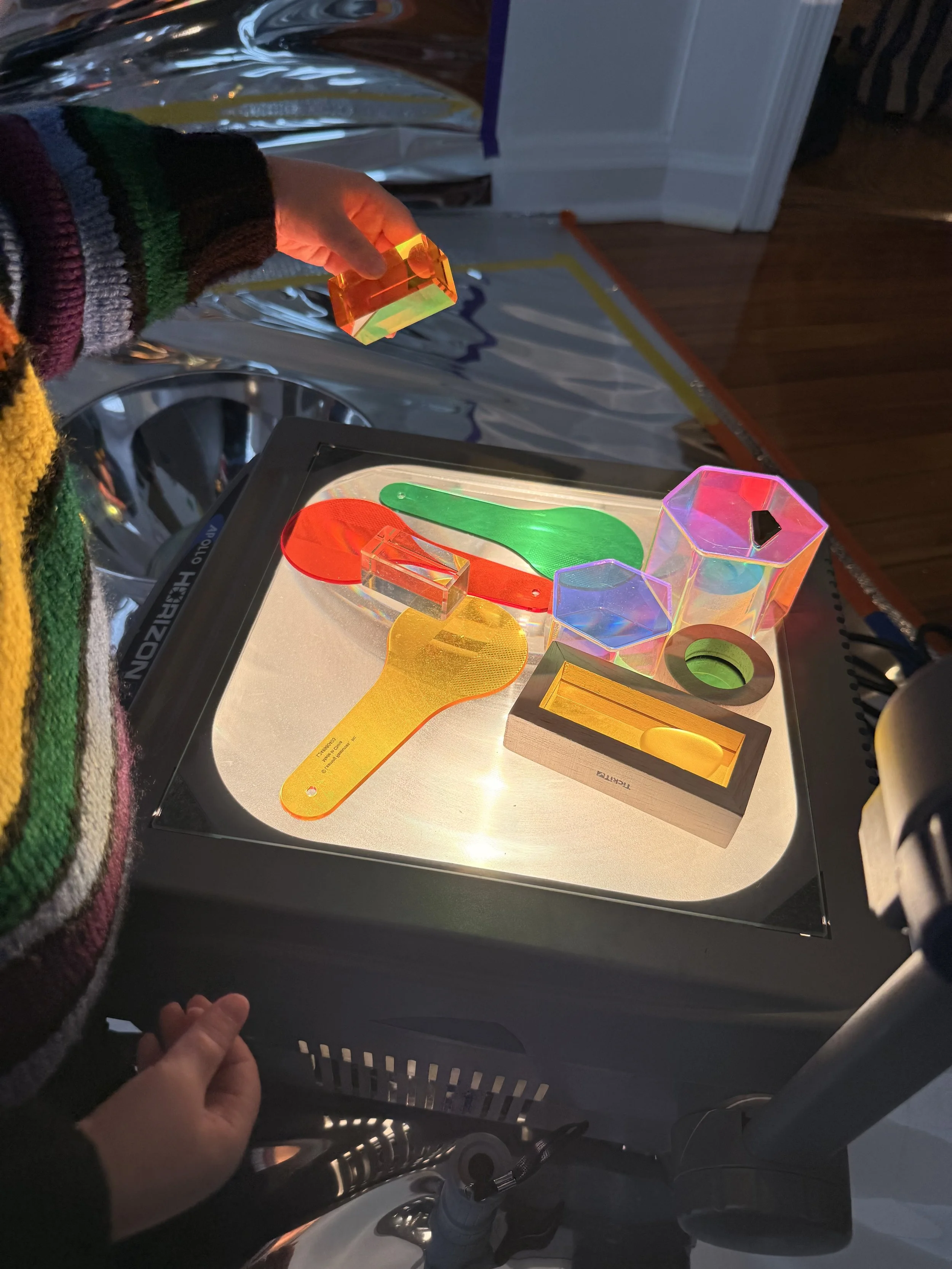 Gigi was immediately captivated. She brought different objects to the projector, watching closely as the colors shifted and stretched across the wall. Her eyes moved back and forth, material to light, light to wall, tracking the changes she was creating.